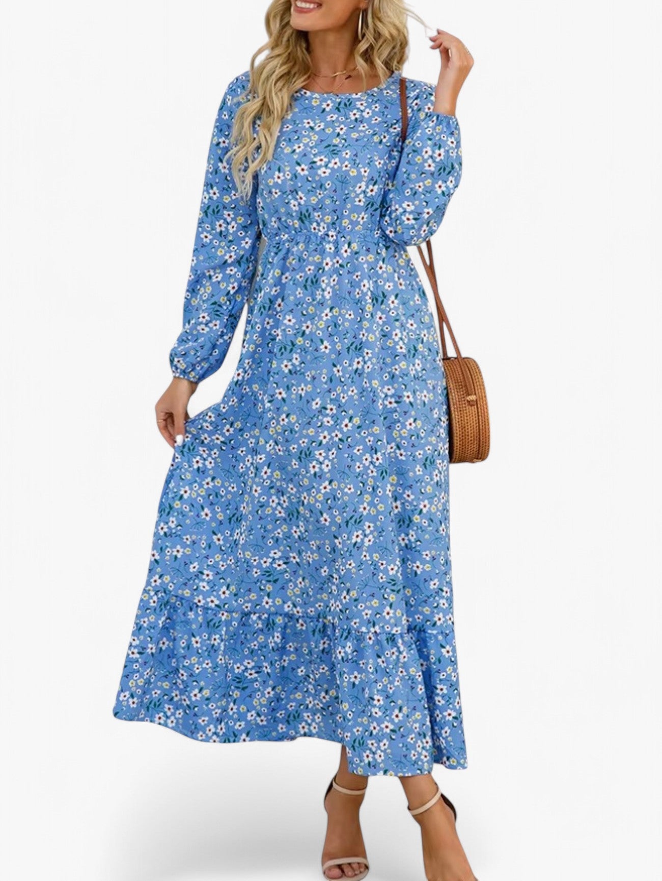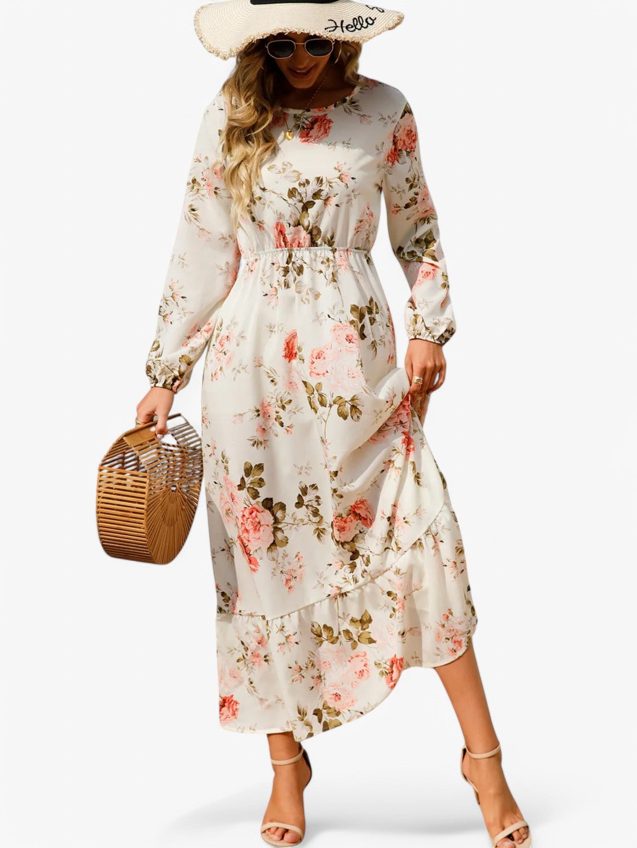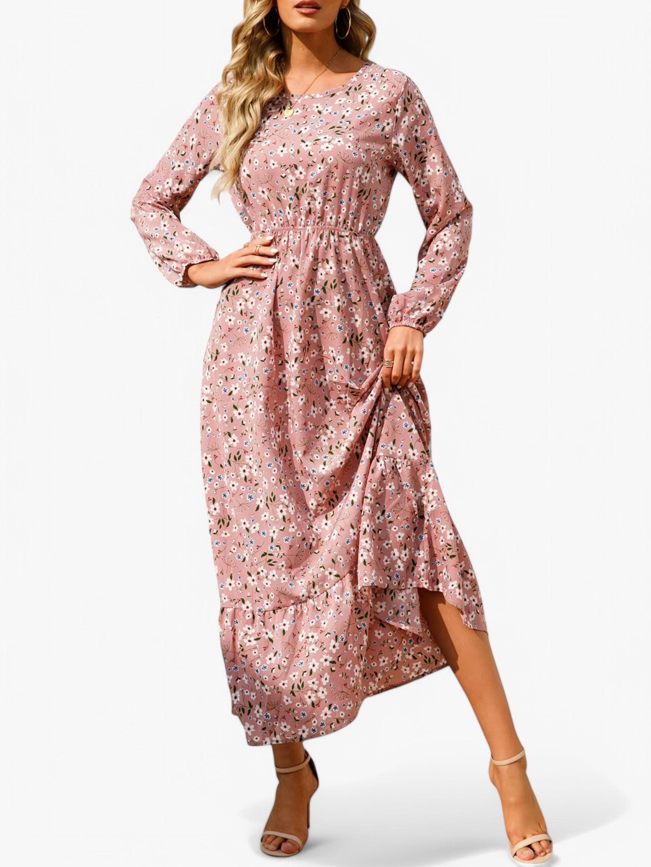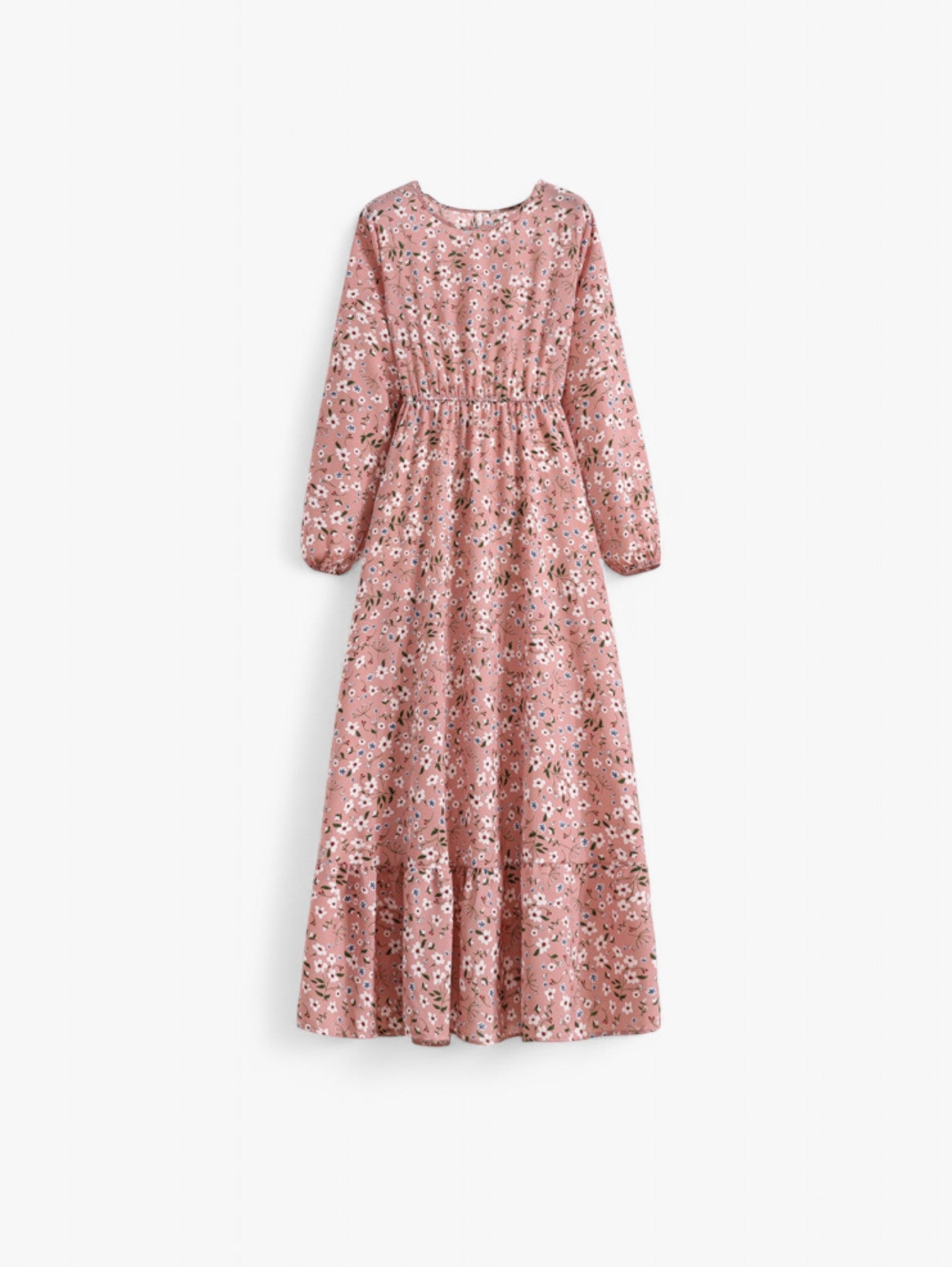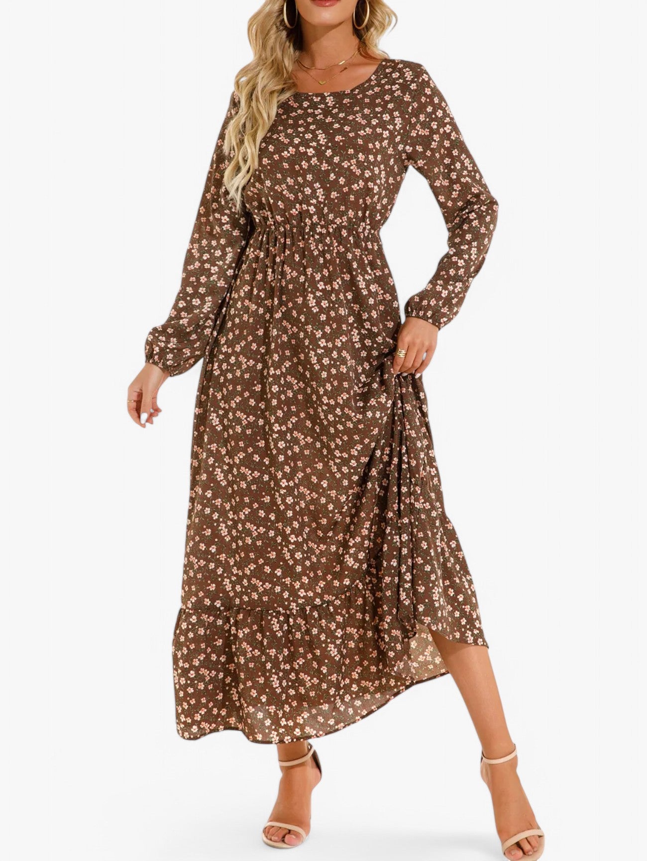 The soft, flowing fabric glides with every step, while the delicate floral print adds a dreamy touch. A cinched waist flatters your silhouette without feeling tight, and the long sleeves offer just the right amount of coverage for breezy days or cool evenings. The ankle-grazing hem creates graceful motion, while the relaxed fit keeps you Fit and assured all day. Easy to dress up or down this is the piece your wardrobe’s been missing.
