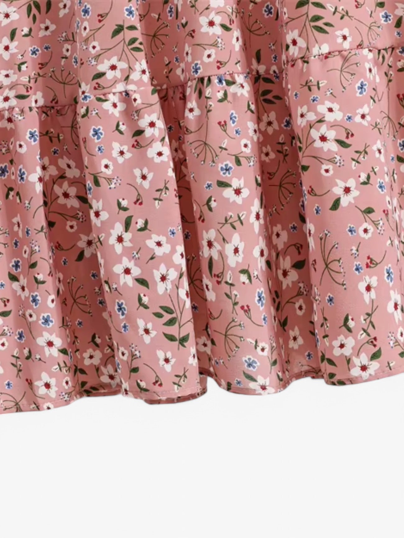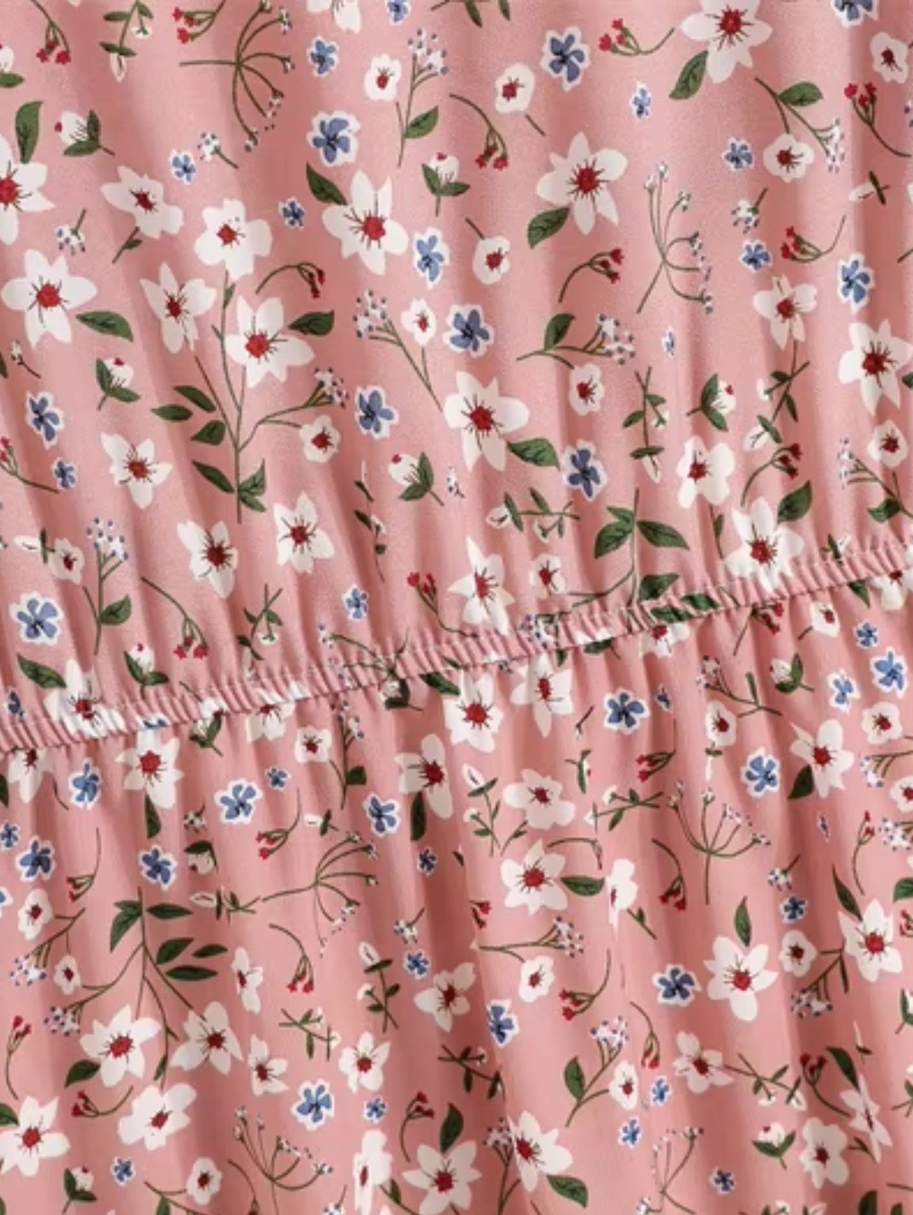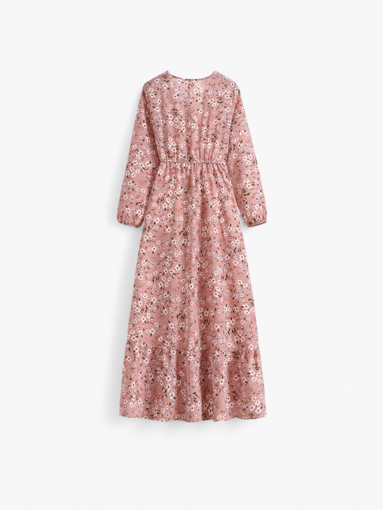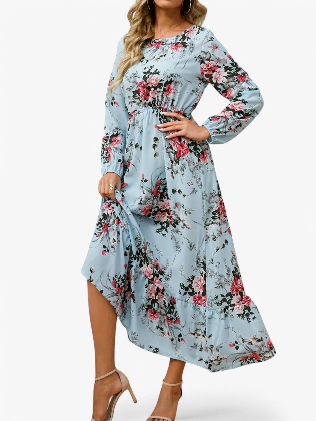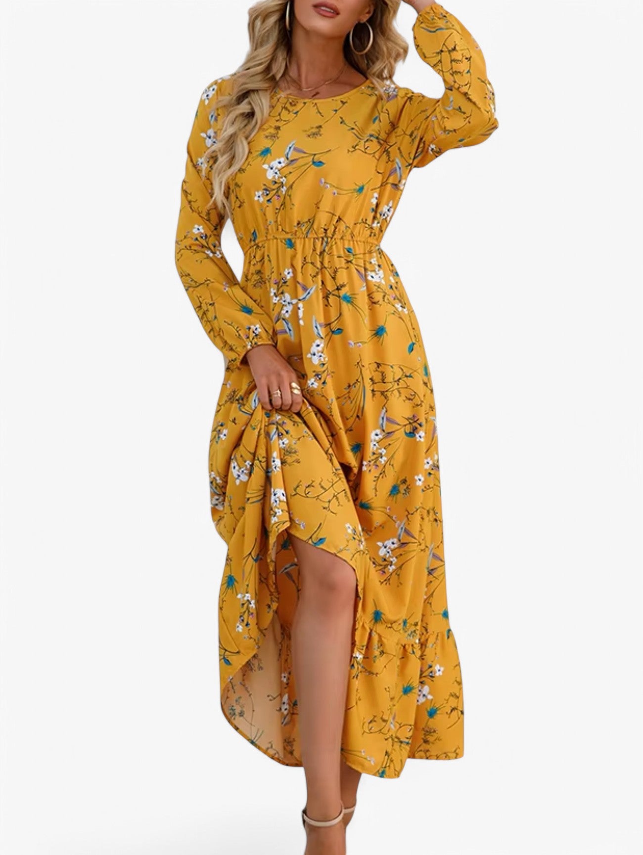 The soft, flowing fabric glides with every step, while the delicate floral print adds a dreamy touch. A cinched waist flatters your silhouette without feeling tight, and the long sleeves offer just the right amount of coverage for breezy days or cool evenings. The ankle-grazing hem creates graceful motion, while the relaxed fit keeps you Fit and assured all day. Easy to dress up or down this is the piece your wardrobe’s been missing.