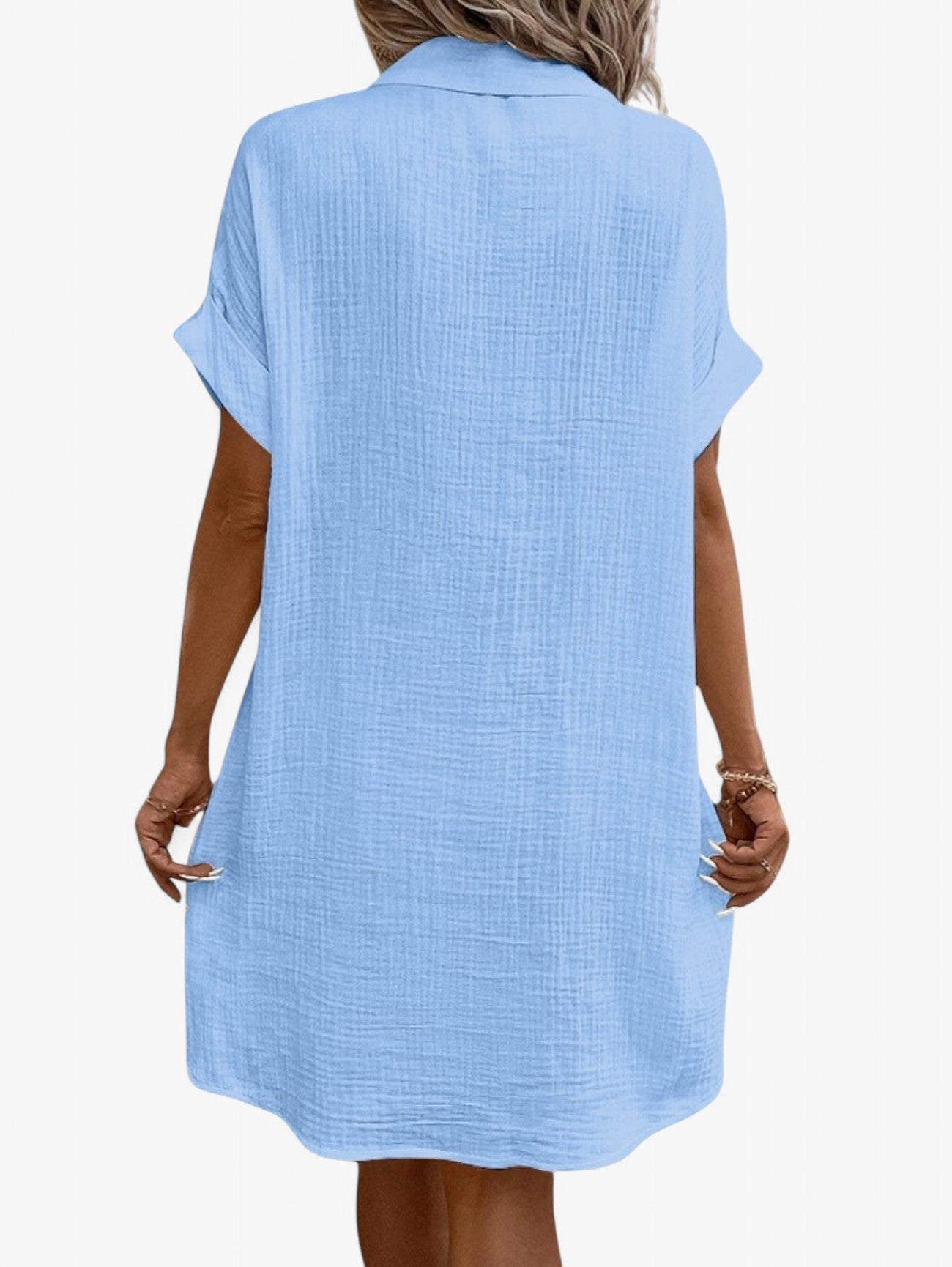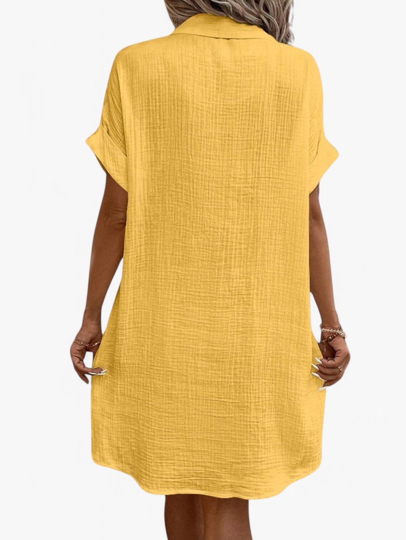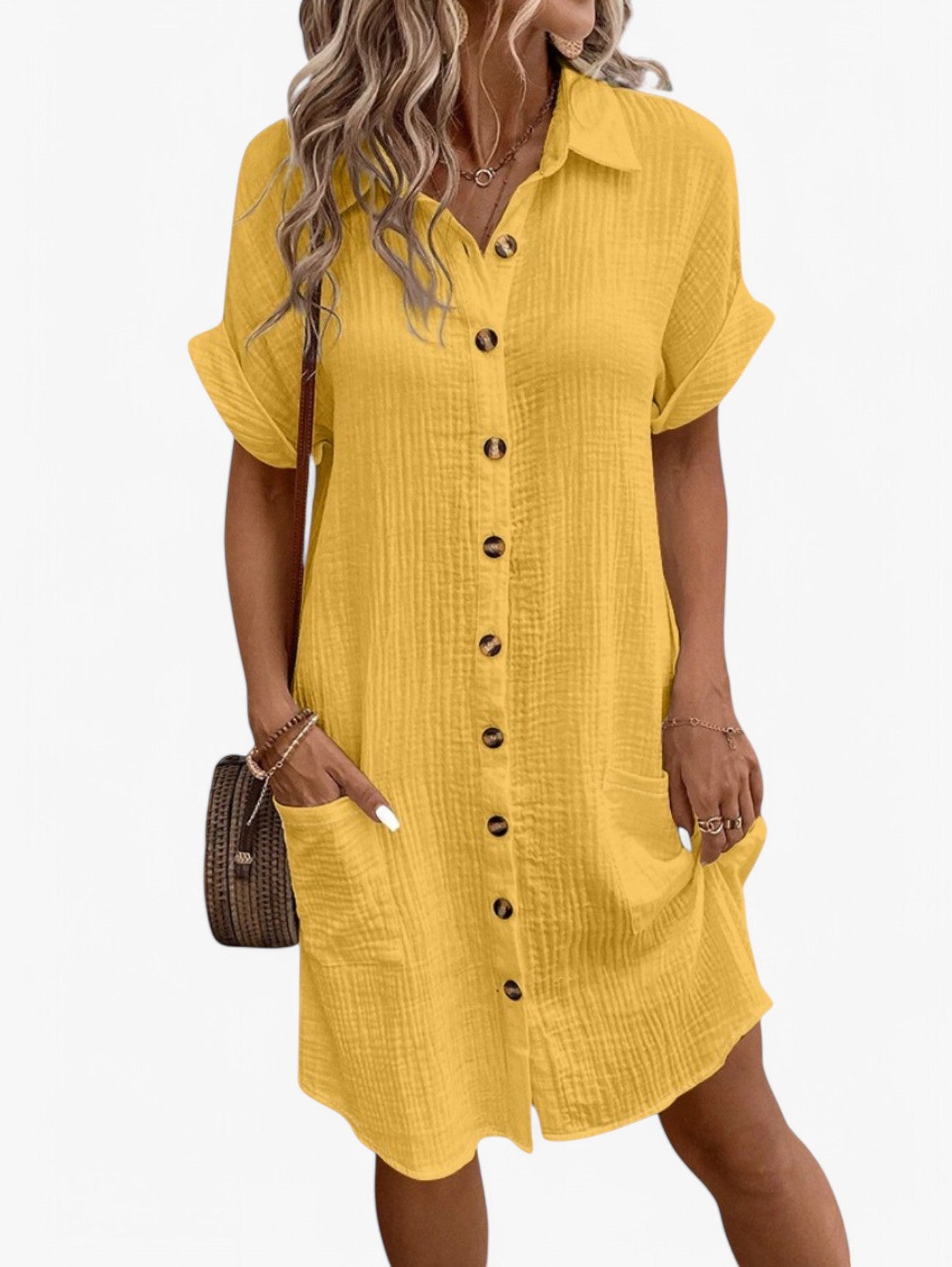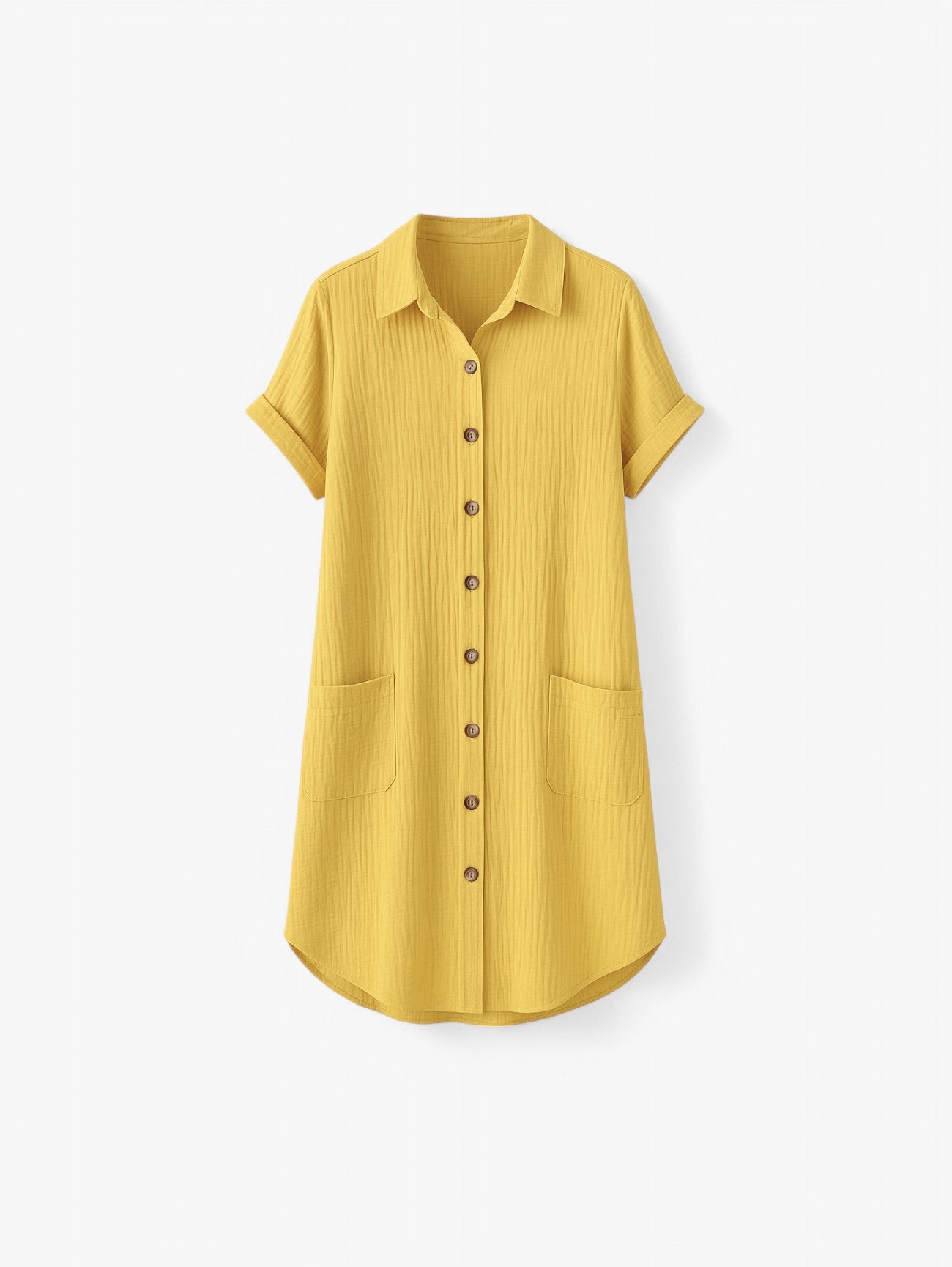 Crafted with a textured fabric that drapes beautifully, this dress moves with you not against you. The relaxed button-down front adds a playful, laid-back charm while letting you adjust the neckline to your vibe. Two roomy pockets mean style doesn’t have to compromise function. The short sleeves are rolled just right for that off-duty, cool-girl look. And the bright, sun-drenched hue? It’s practically style you can wear.