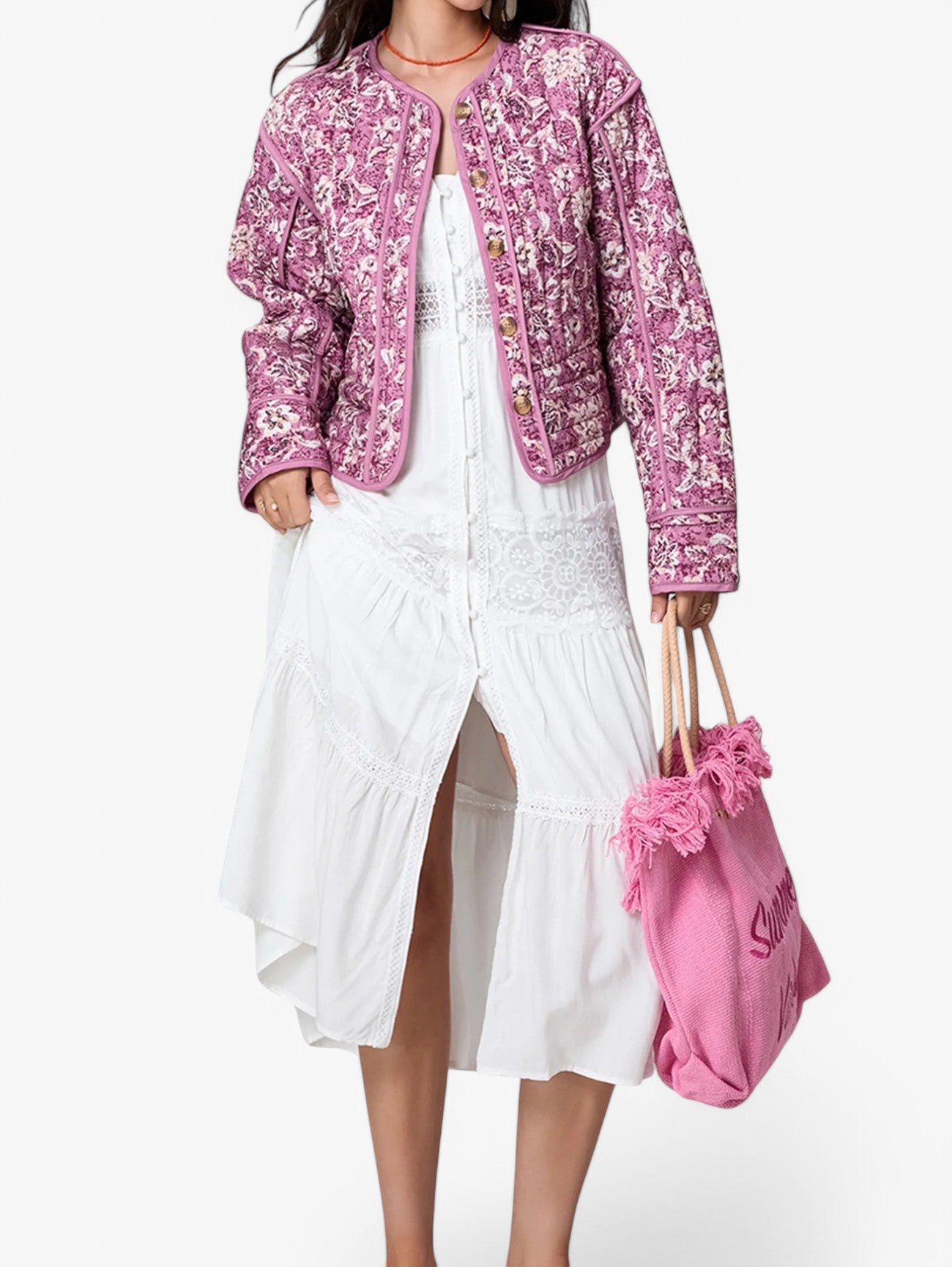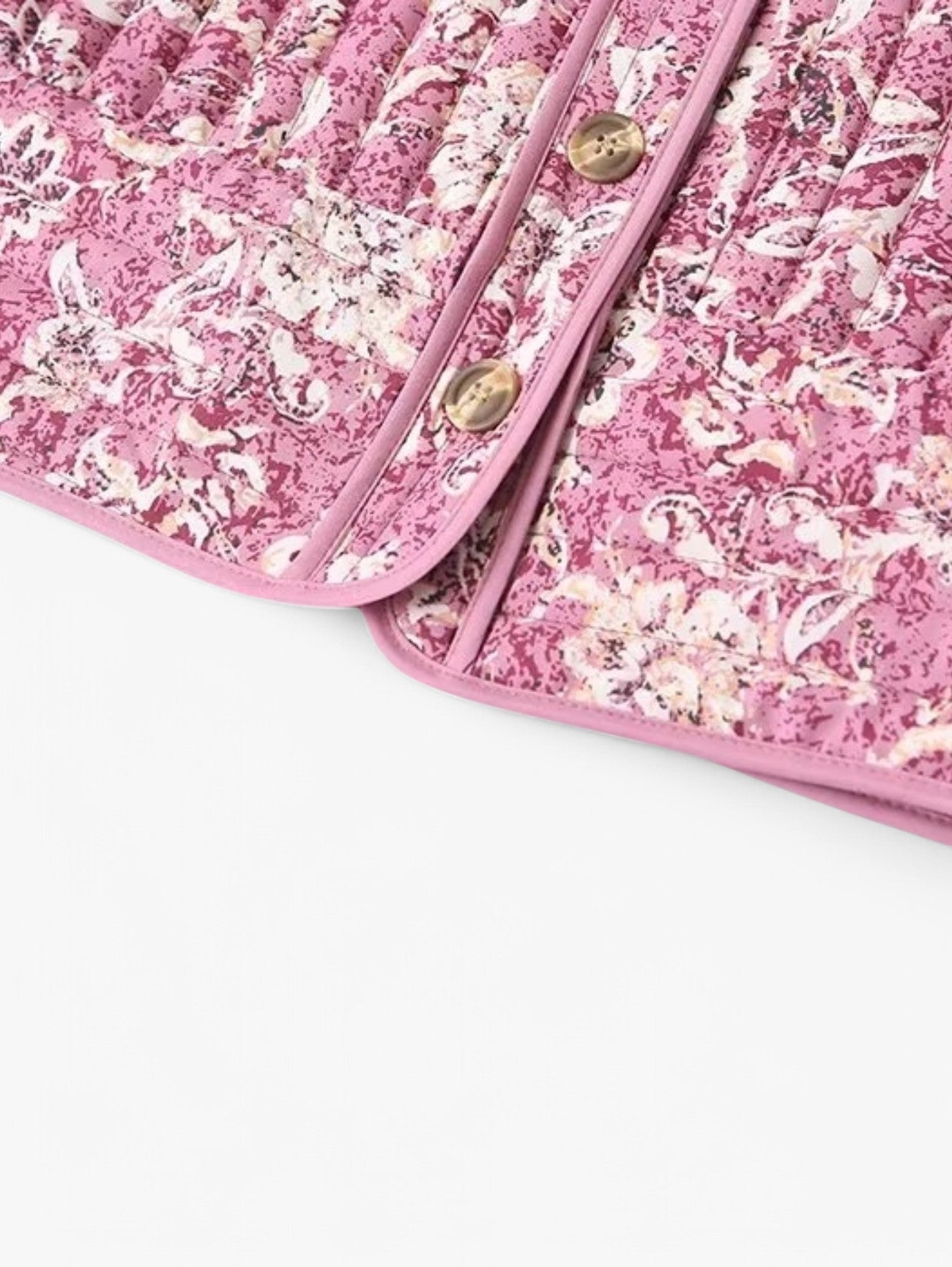 With its rose-pink tones, soft floral print, and vintage-inspired gold buttons, this jacket is the definition of wearable charm. The quilted fabric provides just enough warmth without weighing you down. Its cut flatters your shape while still giving you plenty of room to layer. The button-up front adds a timeless touch, and the stitched pockets offer practicality without sacrificing style. Every detail, from the scalloped edges to the soft feel, is made to make you feel good inside and out.
