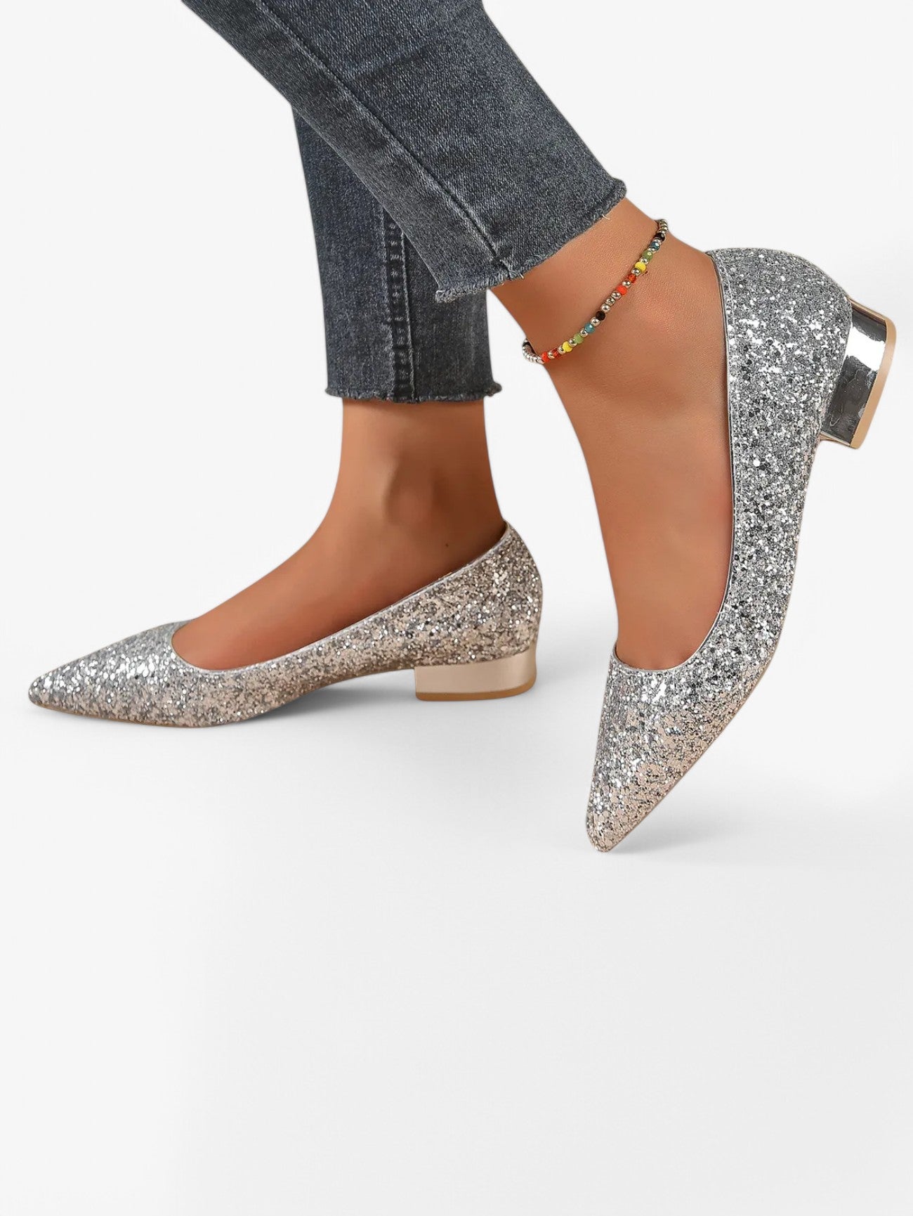 Crafted with a pointed toe silhouette and dazzling glitter exterior, these shoes shimmer with every step you take. The sturdy block heel adds a touch of sophistication while offering stability you can trust from cocktails to midnight strolls.