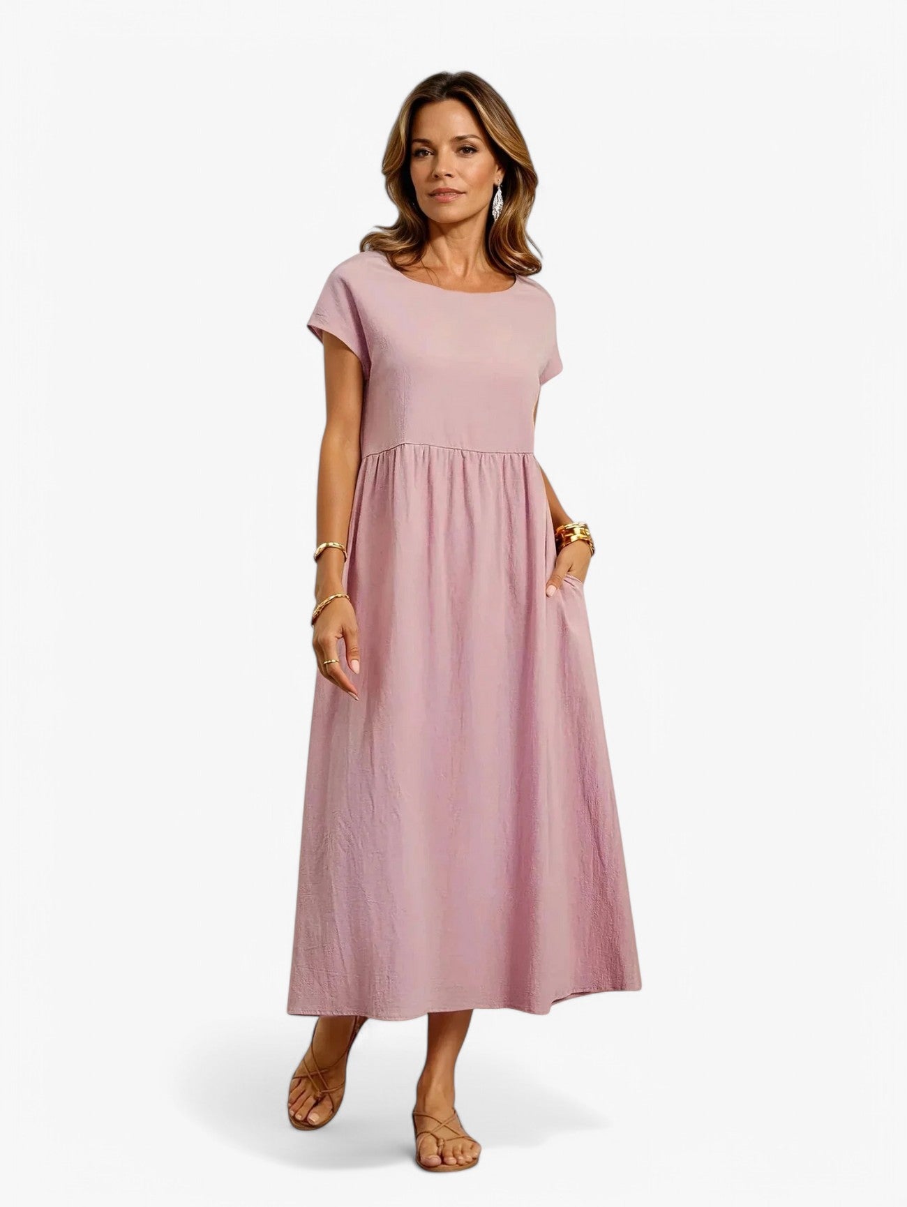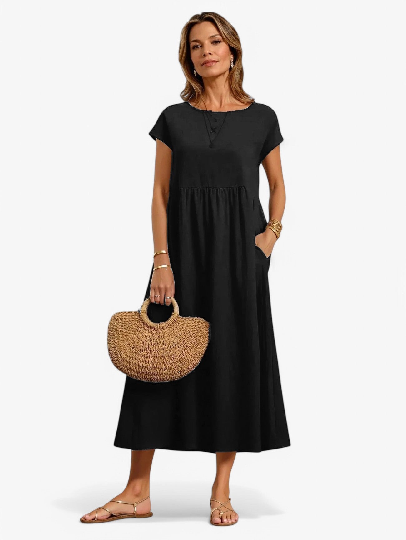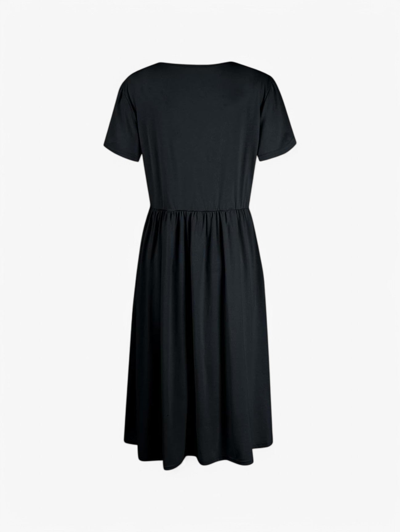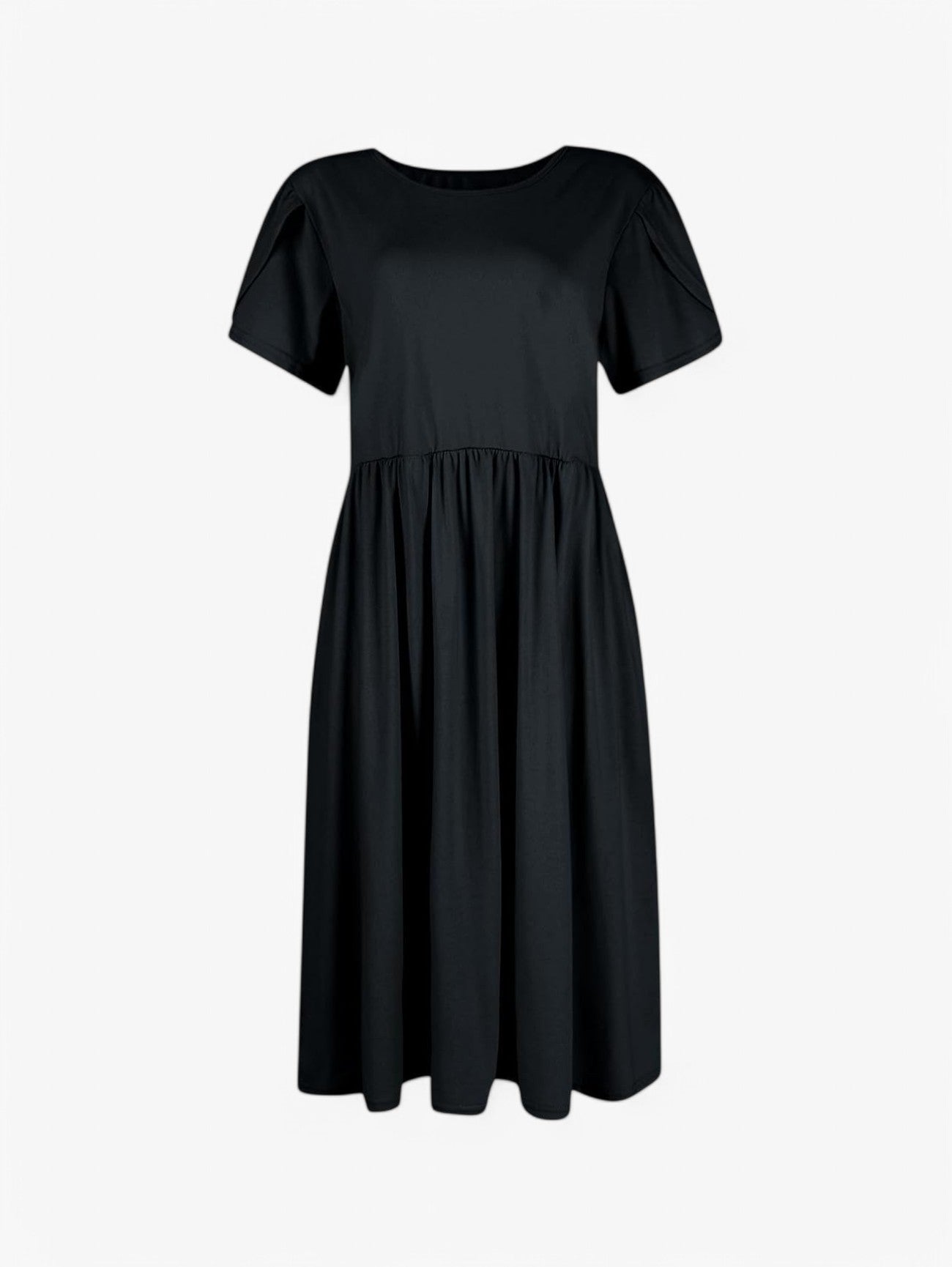 With its flowy fabric and timeless silhouette, this dress is designed to flatter your waistline while keeping you cool through sunny days. The soft pleats fall beautifully from the bodice, creating graceful motion with every step. Short sleeves offer just the right amount of coverage, while the material keeps things breezy. Whether you're running errands or meeting friends, you’ll look put-together and feel like yourself Fit, radiant, and at ease.