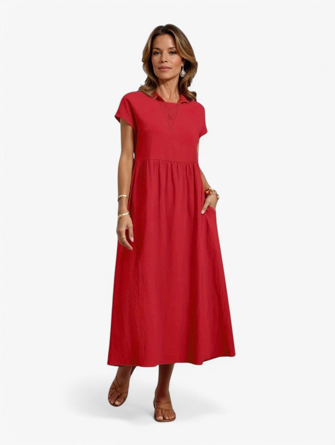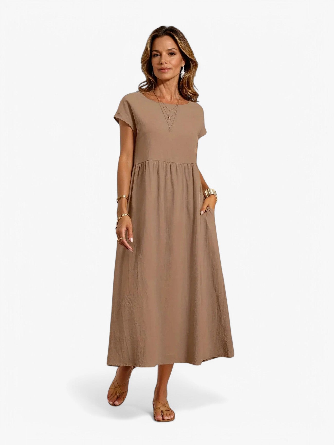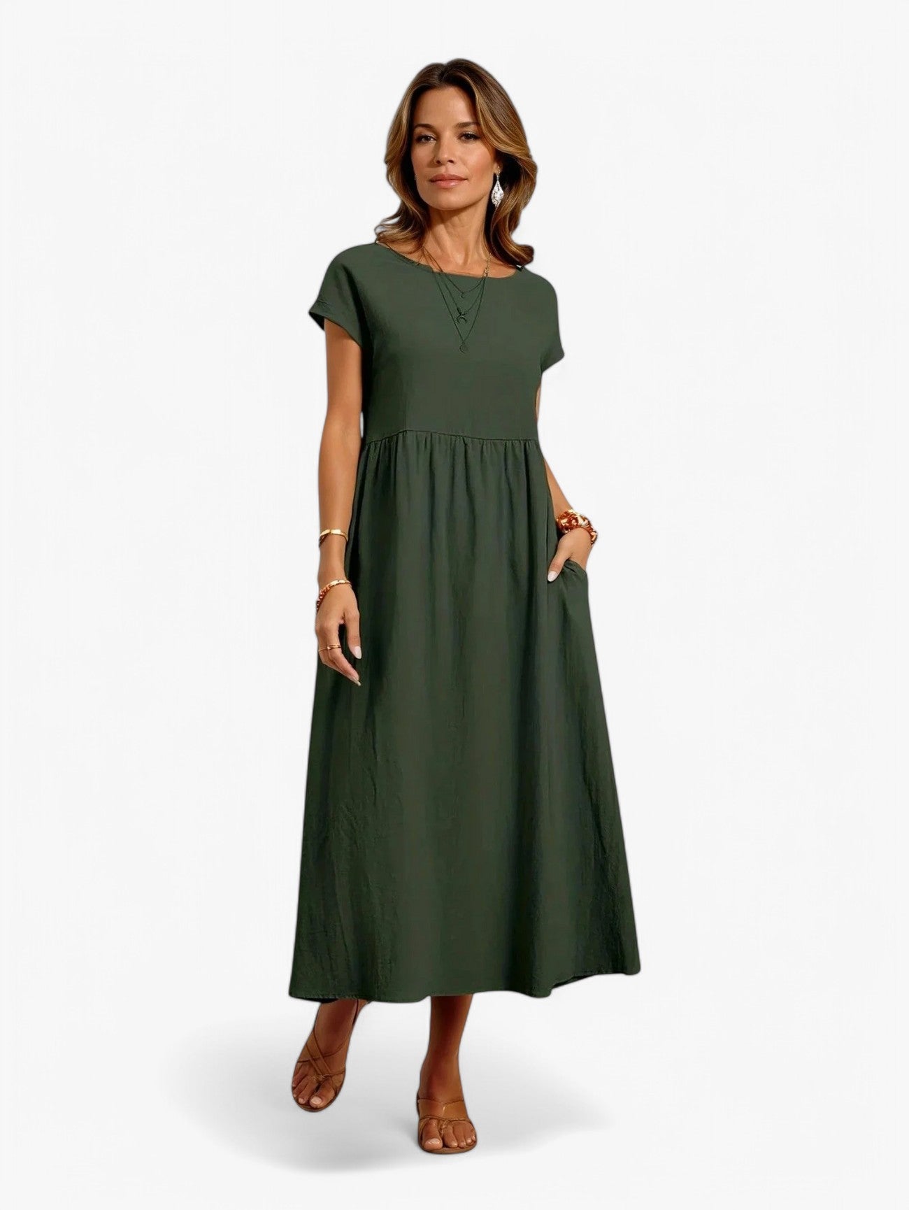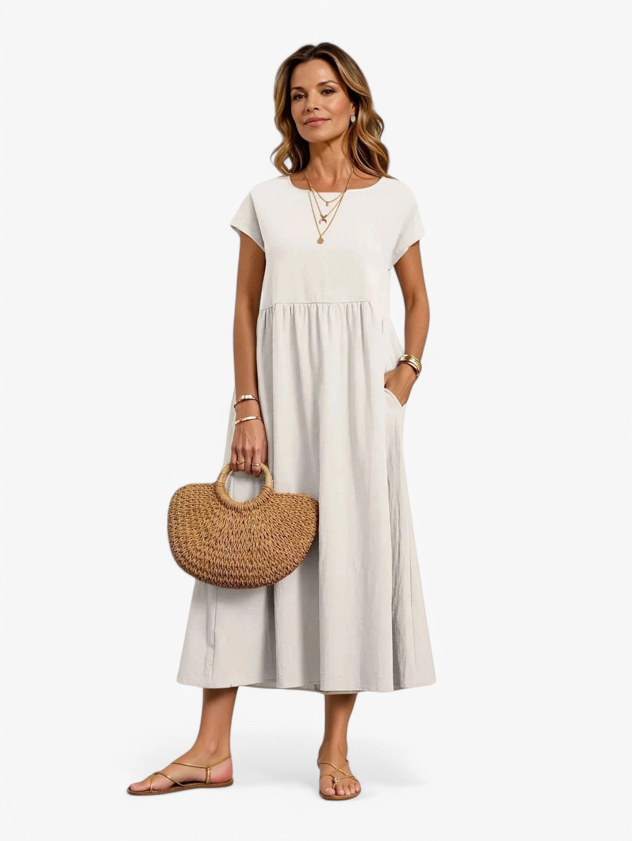 With its flowy fabric and timeless silhouette, this dress is designed to flatter your waistline while keeping you cool through sunny days. The soft pleats fall beautifully from the bodice, creating graceful motion with every step. Short sleeves offer just the right amount of coverage, while the material keeps things breezy. Whether you're running errands or meeting friends, you’ll look put-together and feel like yourself Fit, radiant, and at ease.