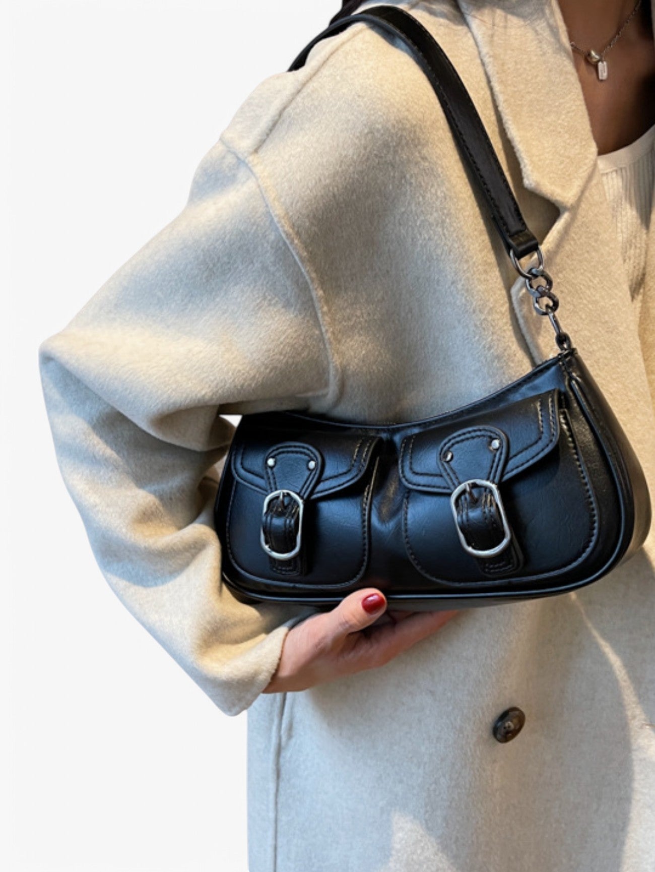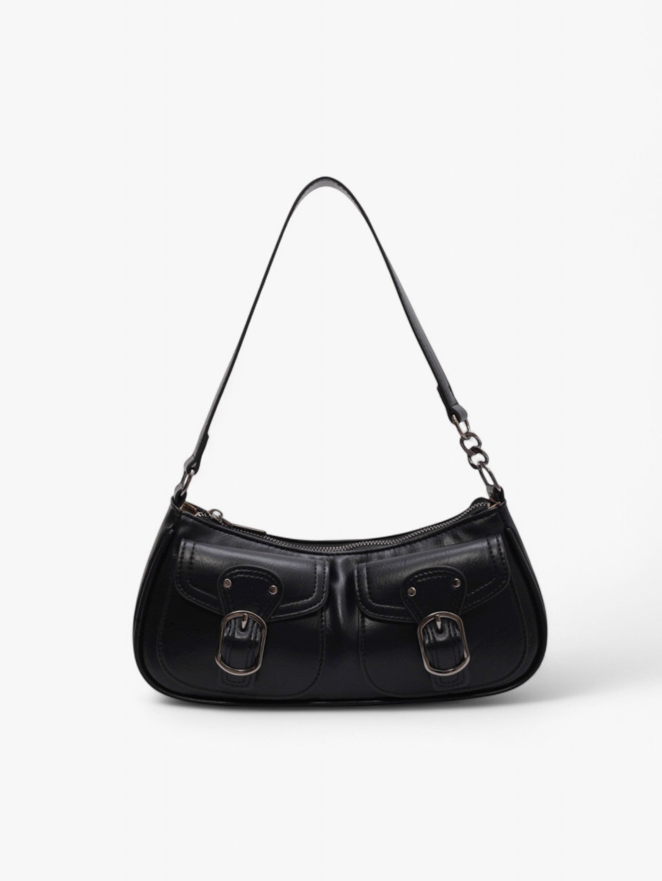 Crafted from sleek material with statement buckle pockets, it blends classic charm with modern edge. The curved silhouette hugs your side, while the structured form keeps your essentials phone, wallet, keys organized and secure. Metal accents add that luxe finish, and the zip-top closure gives you peace of mind on the move. It’s the kind of piece that doesn’t just complete an outfit it defines it.